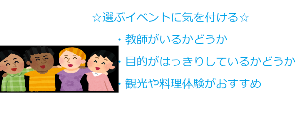 - 自分のレベルに合った、目的がはっきりしているイベントに参加する